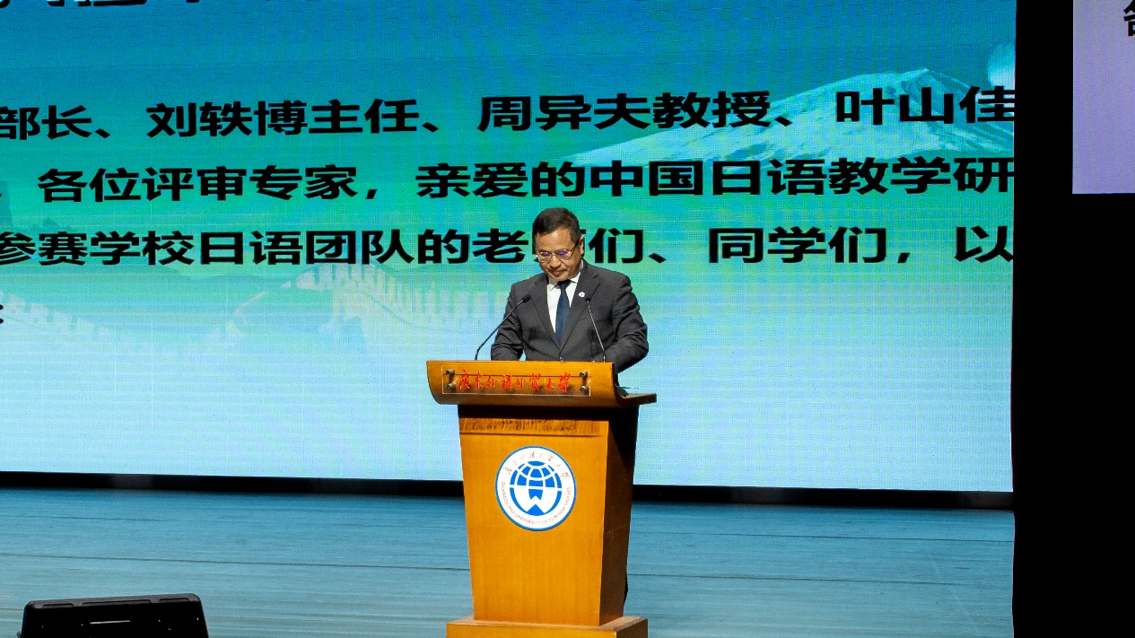 我校黨委常委、宣傳部部長陳彥輝出席活動并致開幕辭,他介紹了我校的基本情況、辦學特色以及廣外日語專業的發展歷程,同時指出本賽事是國內日語界最具影響力的賽事之一,旨在增進中日兩國人民情誼,強化相互理解,激發我國大學生日語研習熱忱。他鼓勵各位選手能夠在這個舞臺上把握機會,展現自我,錘煉本領,為推動中日友好往來積蓄正能量。