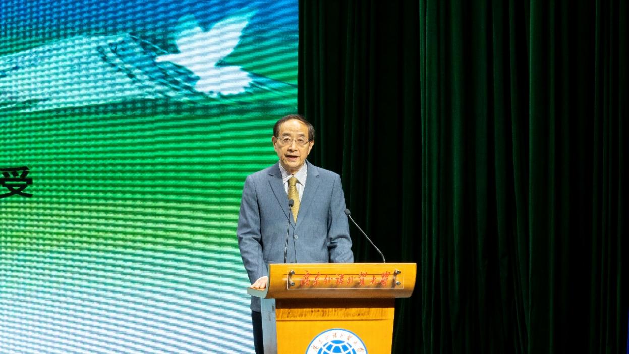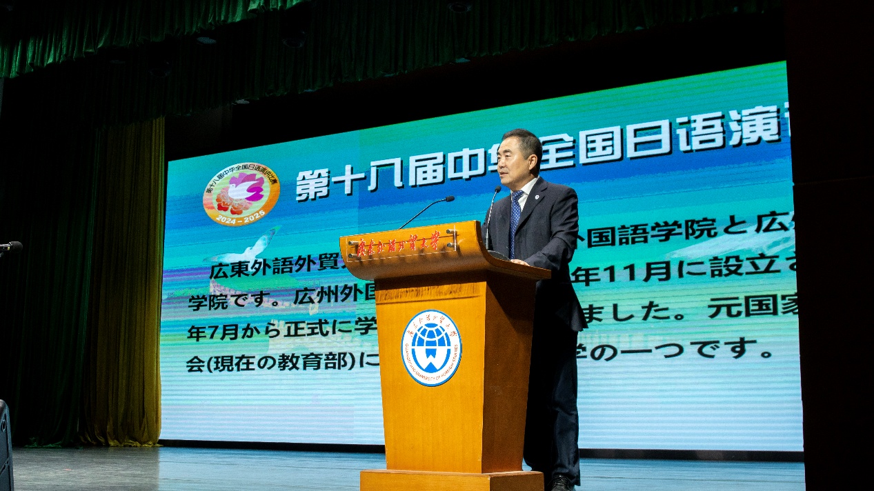 中國日語教學研究會會長、廣東外語外貿大學日語語言文化學院名譽院長陳多友為賽事進行了致辭。他向承辦比賽的廣東外語外貿大學日語學院表示了感謝。隨后向參賽選手提出三點建議,期望同學們盡情展示才能,珍惜交流學習機會,享受比賽過程。鼓舞每一位日語學子拼搏進取,為中日教育互鑒與協作交流助力。
