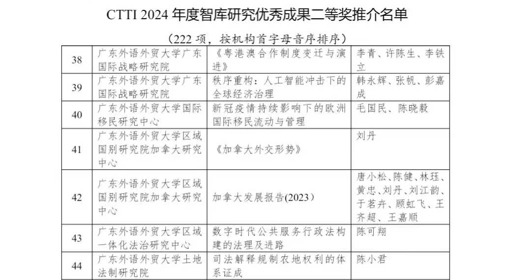 廣東國際戰略研究院《粵港澳合作制度變遷與演進》《秩序重構:人工智能沖擊下的全球經濟治理》、國際移民研究中心《歐洲國際移民流動與管理》、區域國別研究院加拿大研究中心《加拿大外交形勢》、區域國別研究院加拿大研究中心《加拿大發展報告(2023)》、區域一體化法治研究中心《數字時代公共服務行政法構建的法理及進路》、土地法制研究院《司法解釋規制農地權利的體系證成》獲CTTI2024年度智庫研究優秀成果二等獎。