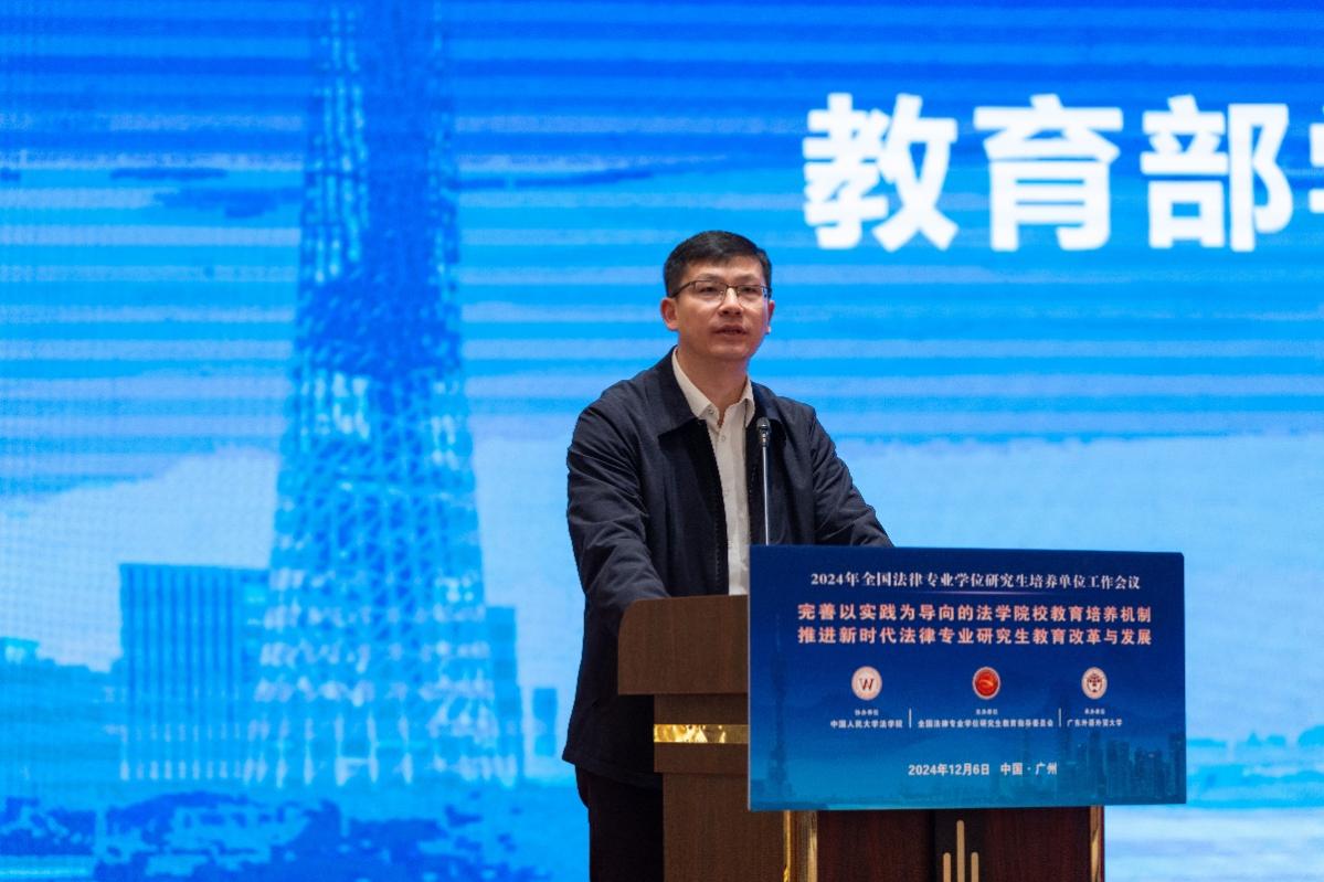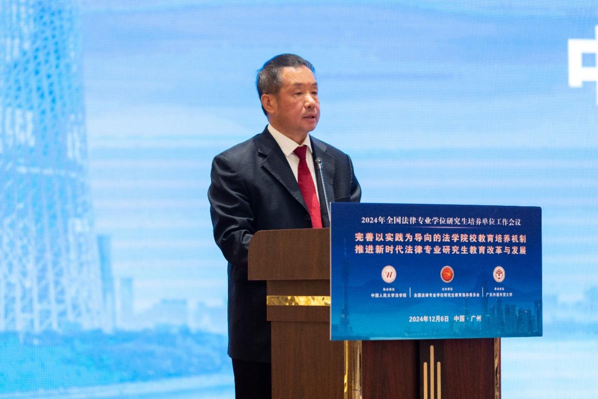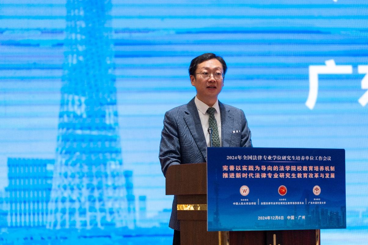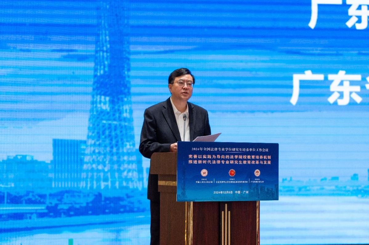 廣東省委教育工作委員會委員、廣東省教育廳黨組成員、副廳長馮偉在致辭中指出,近年來,廣東省委、省政府圍繞中央關于教育強國建設的決策部署和省委“1310”的具體部署,把扎實推進教育高質量發展、建設教育強省作為工作主線,深入推進實施八大工程,加快建設高質量教育體系,以實施高等教育“沖一流、補短板、強特色”提升計劃為抓手,深入推進廣東研究生教育的內涵式發展,不斷深化研究生培養模式的改革。在人工智能技術飛速發展的背景下,未來的法學教育要培養與未來接軌的法律人才。他希望通過本次會議的交流和研討,共同探尋法學專業學位研究生教育人才培養體系的路徑,推動法學研究生教育邁向內涵式提升和高質量發展的新階段。