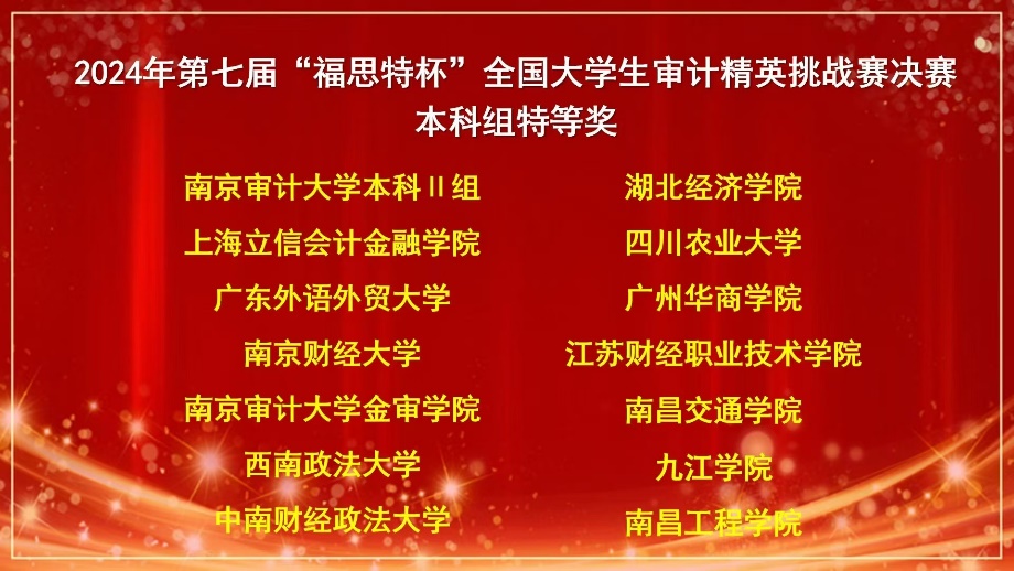 第七屆“福思特杯”全國大學生審計精英挑戰賽決賽在南京審計大學舉辦。我校在決賽中與來自中南財經政法大學、西南財經大學、南京審計大學、云南大學、山東財經大學等全國104所兄弟院校、800余名師生同臺競技。
