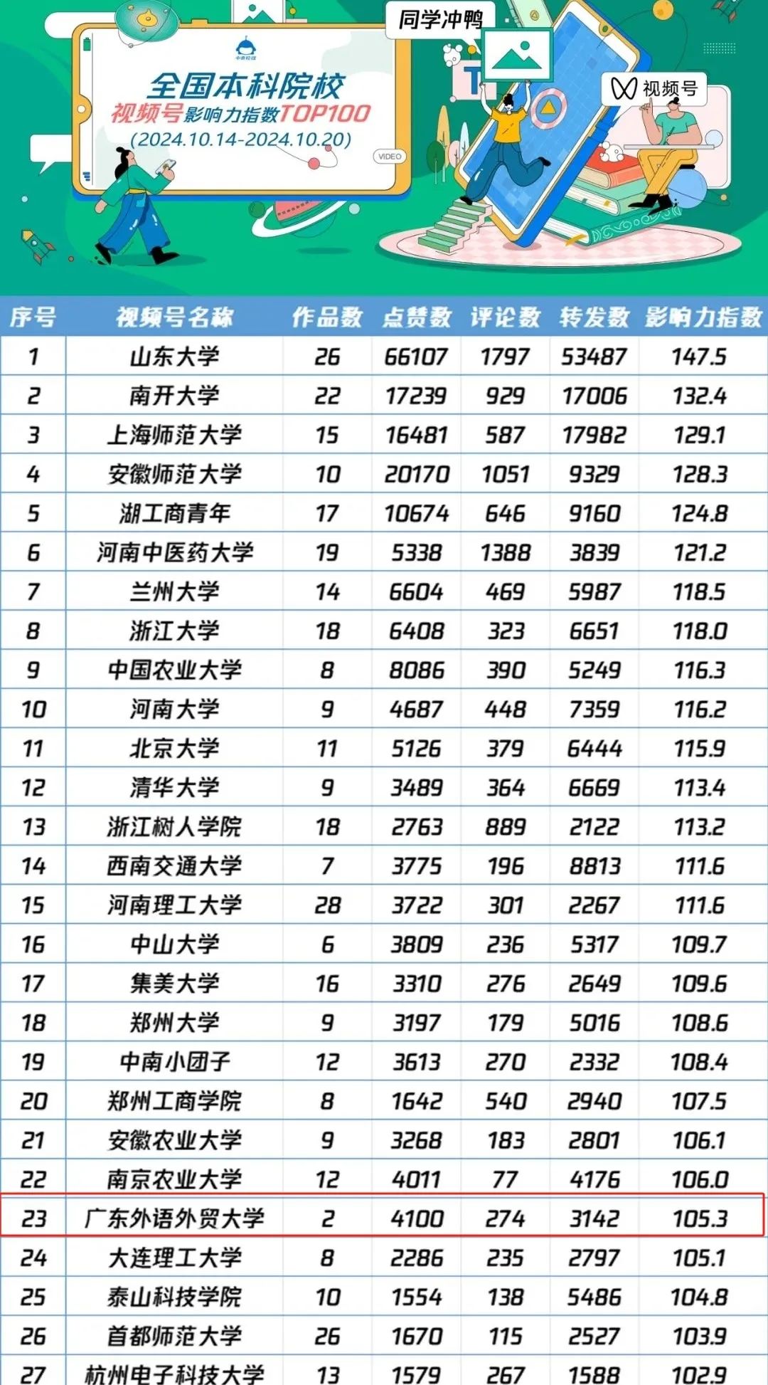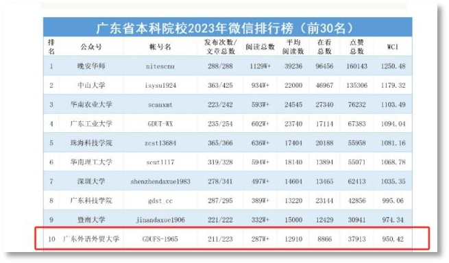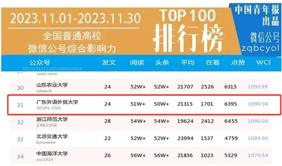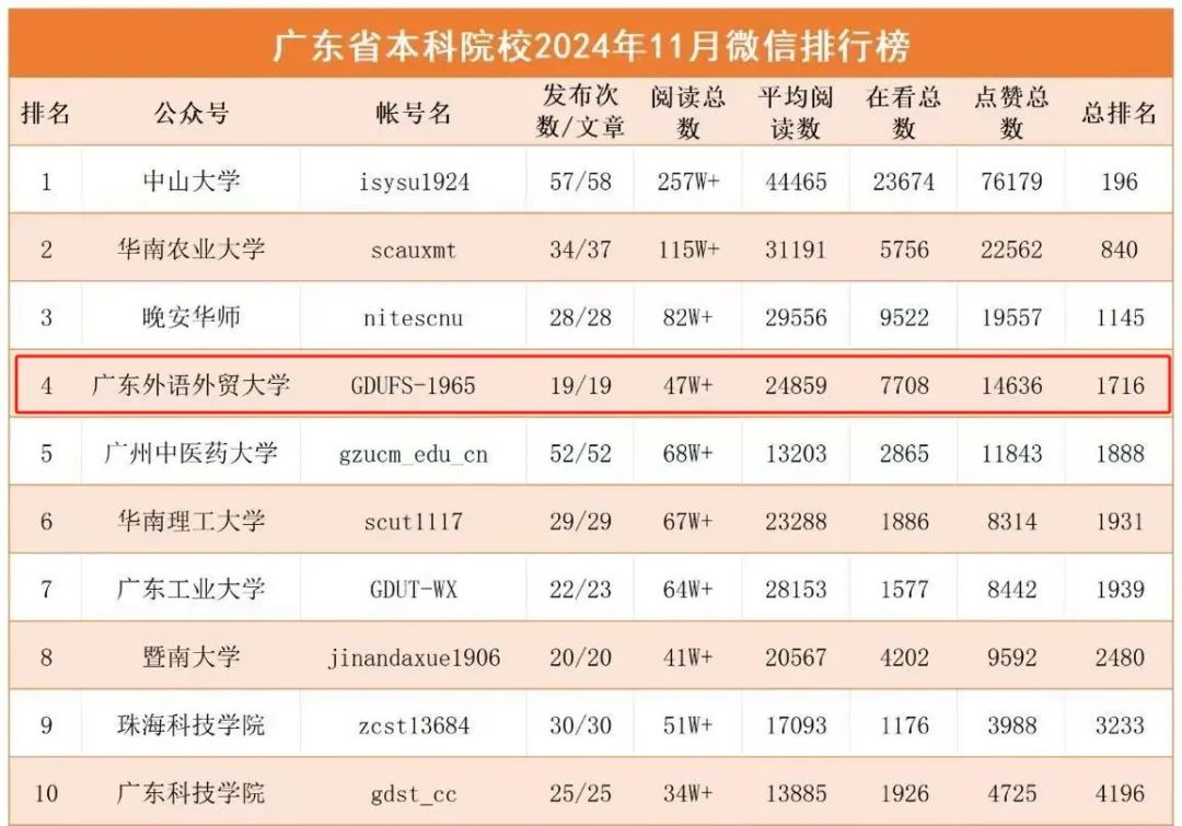 2024年,廣外官微闊步前行,多項排名再創(chuàng)新高。在廣東省本科院校2024年11月微信排行榜排名第4,《廣外生日快樂!60周年校慶公告發(fā)布》等推文閱讀量突破10萬,在2024年11月廣東本科院校微信熱文榜排名第2。