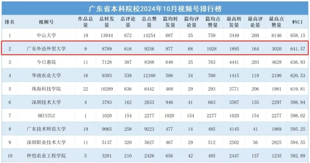 廣外在短視頻方面也有突出表現(xiàn),在中青校媒推出的全國高校視頻號綜合影響力排行榜中,廣外視頻號在2024年10月周榜單中位列全國高校第23,外語類院校第1,廣東高校第2。在廣東教育推出的廣東高校微信視頻號排行榜中,廣外視頻號在2024年10月月榜單中位列廣東高校第2,在11月月榜單中位列廣東高校第4。