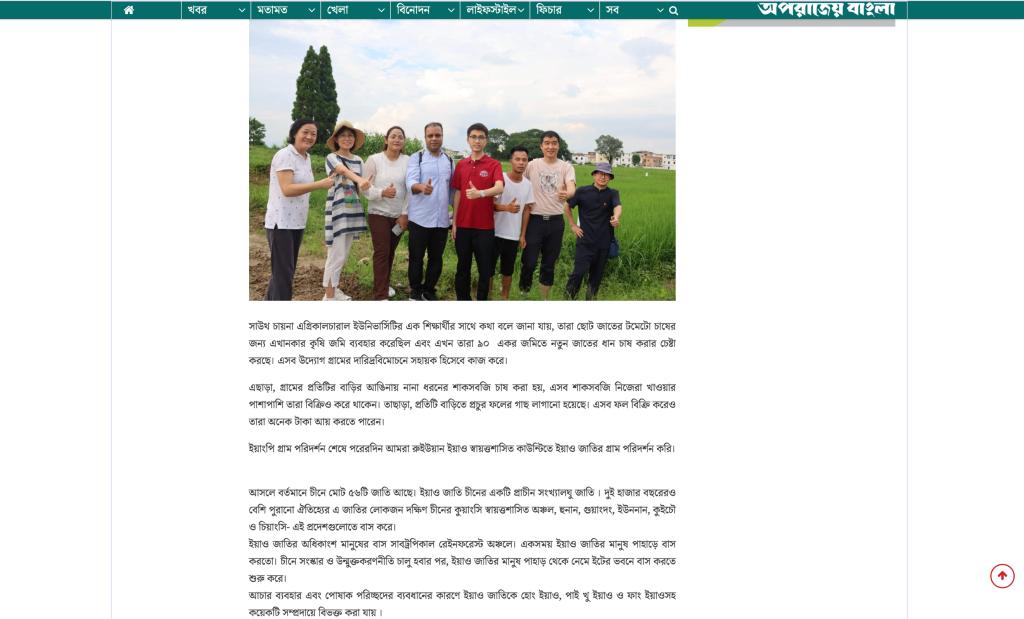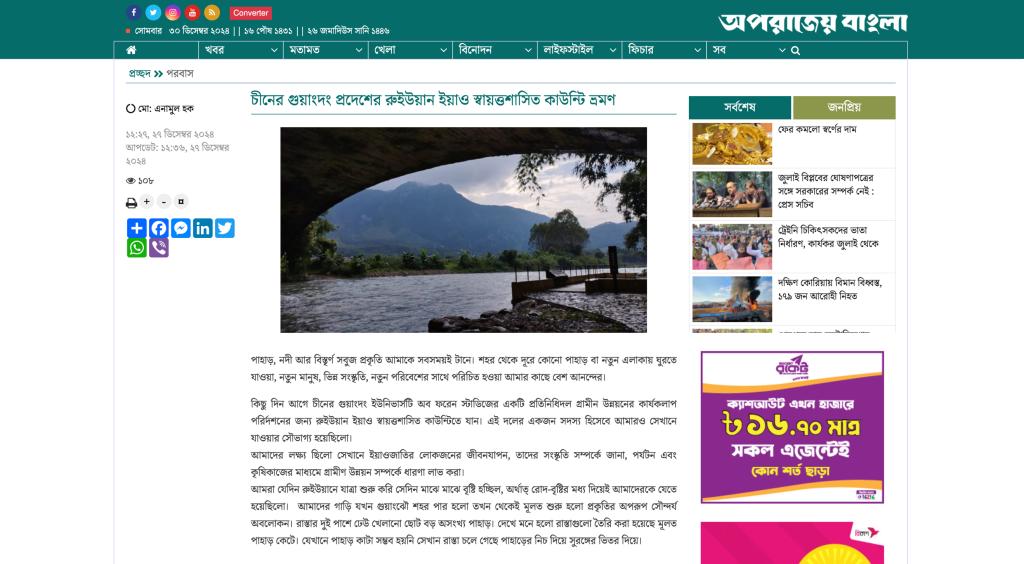 本網訊 近日,亞非學院孟加拉語專業外籍教師伊納穆勒·毫克用孟加拉語撰寫了宣傳我校鄉村振興工作和介紹瑤族文化的文章,發表在了孟加拉國媒體網站Aparajeobangla上。Aparajeobangla是孟加拉國的孟加拉語——英語在線新聞門戶網站,廣受孟加拉國年輕讀者的歡迎。