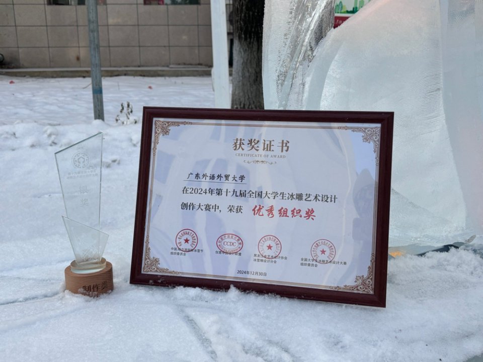 本網訊 2024年12月28日至30日,“第十九屆全國大學生冰雕藝術設計創作大賽”在哈爾濱舉辦。在這片被冰雪覆蓋的廣闊舞臺上,廣東外語外貿大學藝術學院團隊,作為廣東省唯一入圍的代表團隊,猶如一股清新的南風輕拂過北國的嚴寒,為這場冰雪盛宴增添了一抹別樣的色彩,南國藝術之花在北國絢麗綻放。他們的作品在眾多佳作中脫穎而出,榮獲“制作類銀獎”。學校獲評“優秀組織獎”,廣外藝術學院院長王凱宏、教師沈業和陳雁鵬獲“優秀指導老師獎”。