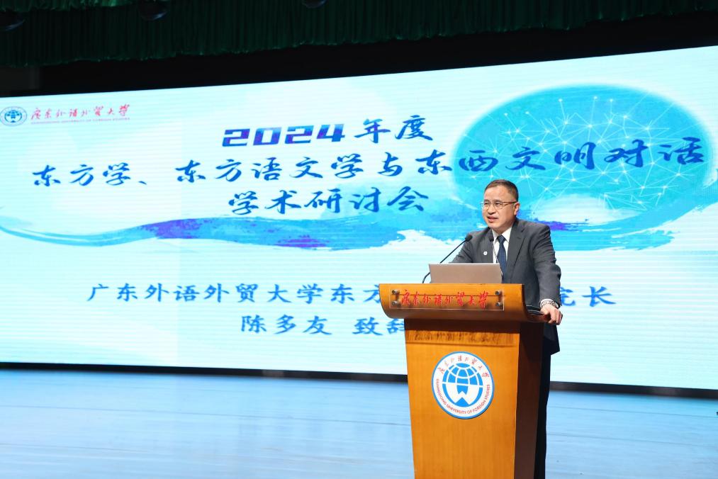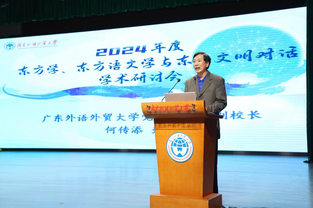 開幕式上,我校副校長何傳添在致辭中首先代表學(xué)校向與會嘉賓致以最誠摯的歡迎,并指出廣外作為語言文學(xué)研究的重鎮(zhèn),長期致力于推動?xùn)|方學(xué)研究的學(xué)科建設(shè)和學(xué)術(shù)發(fā)展。本次研討會將聚焦區(qū)域國別研究、東西文明對話等前沿議題,為學(xué)術(shù)界提供思想碰撞的契機(jī),為學(xué)科建設(shè)注入強勁的新動力。