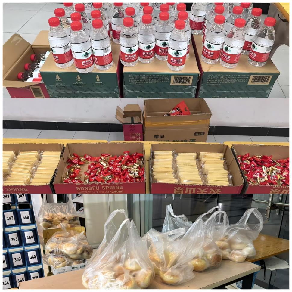 因本次考試時間較長,為保障監考人員在兩場考試之間能夠及時補充能量,以飽滿的精神狀態投入到監考工作中,學校還精心準備了簡便的零食物資,讓監考人員感受到溫暖與關懷。