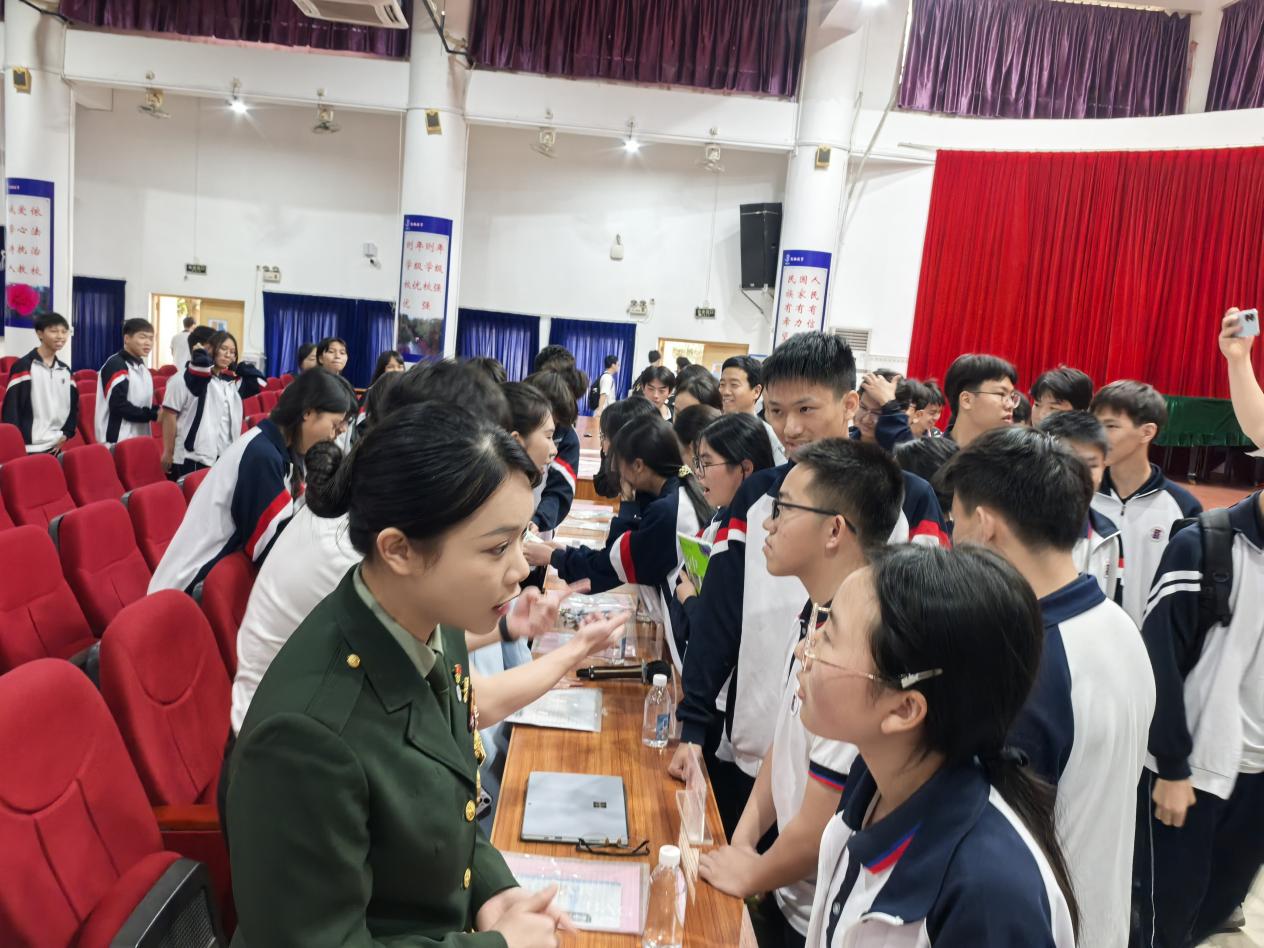 互動環節中,清新區三中學生踴躍向主講人提問,主講人耐心解答同學們疑惑,現場氣氛熱烈。“我覺得參軍入伍最重要的是意志。我剛剛就看到你們頂著烈日開展國旗班訓練,這種意志值得點贊,期待我們在部隊里相見!”宣講團成員胡敘妍給予該同學贊賞與肯定,并為他解讀剖析了相關入伍政策。
