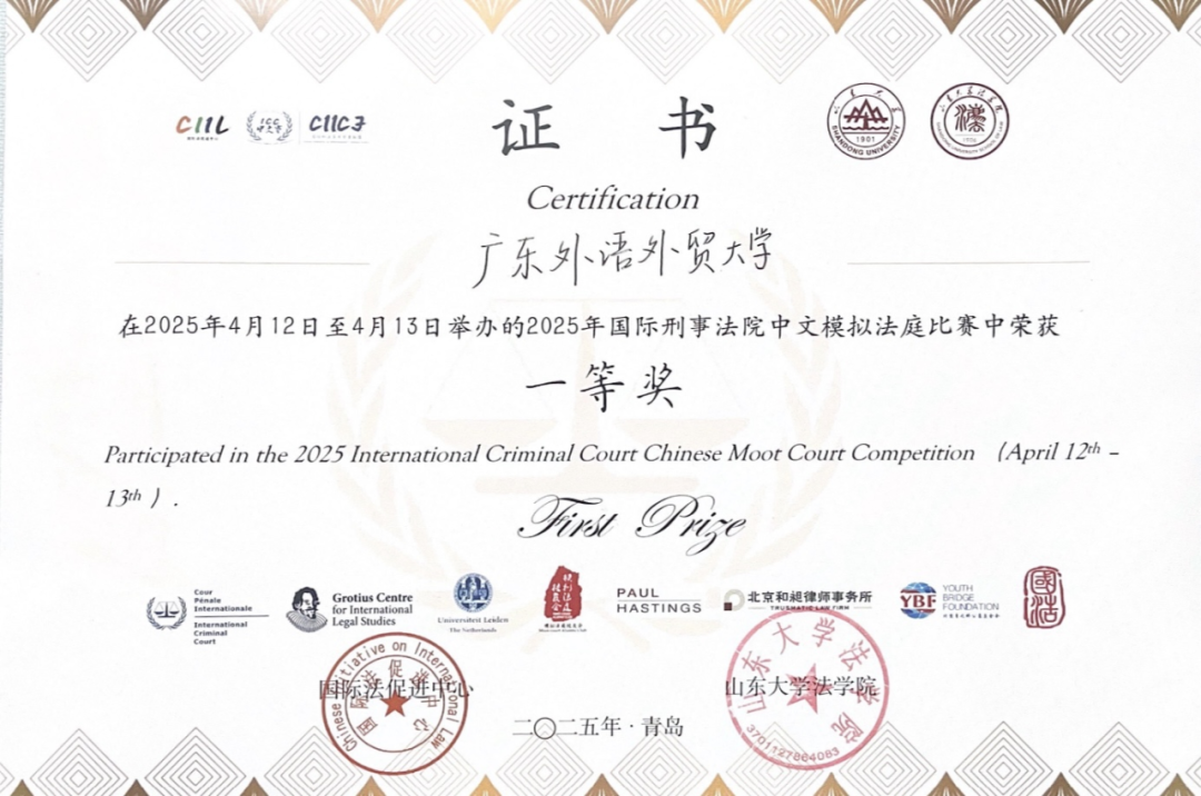 本網訊 4月13日,ICC國際刑事法院中文模擬法庭競賽在山東大學(青島校區)落下帷幕。廣東外語外貿大學法學院代表隊從清華大學、北京大學國際法學院等103支頂尖高校隊伍中脫穎而出,以優異成績摘得全國一等獎,獲得代表中國賽區赴荷蘭海牙參加國際賽的資格。這是我校繼2018年獲得該項賽事全國一等獎之后,我校代表隊第七次獲此殊榮。