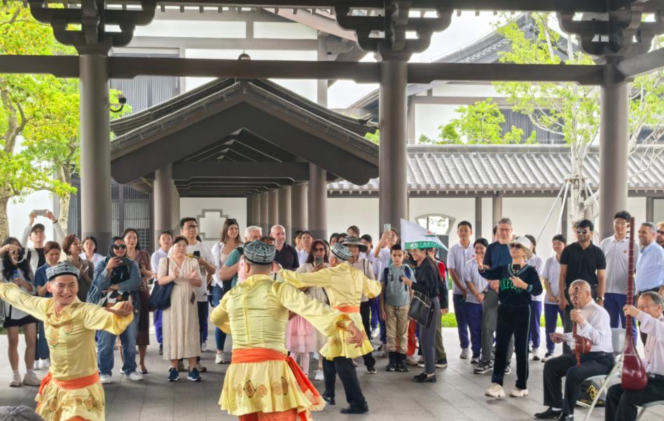 活動伊始,外教們進入文化館園區,便被熱情奔放的民族特色歌舞表演所吸引。舞者們身著鮮艷的民族服飾,伴隨著歡快的音樂節奏,展現了濃郁的民族風情。外教們紛紛駐足欣賞,有的還情不自禁地跟著音樂節奏搖擺,現場氣氛熱烈。